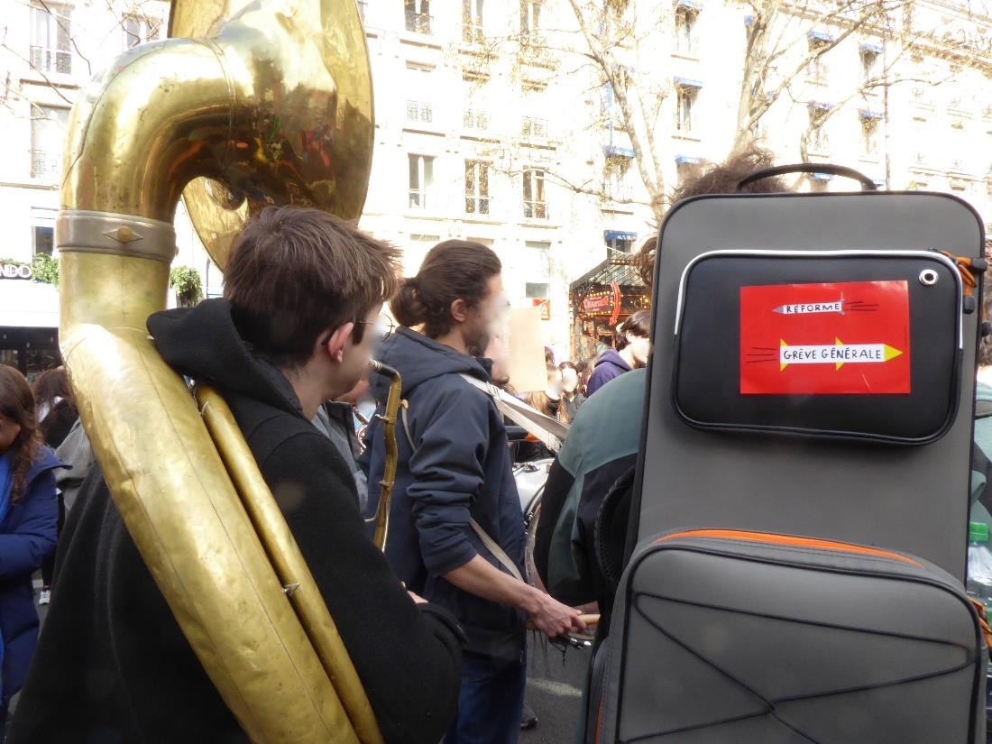 Wir suchen wieder einmal den Anfang der Demo und uns ist nicht mal klar, in welche Richtung es losgehen soll. Ariane kann sich nicht vorstellen, dass es wirklich in die Innenstadt gehen soll, Richtung Louvre, Rue de Rivoli, ins edle Stadtzentrum. Aber wirklich, es geht in die Innenstadt und nachdem wir eine ganze Weile herumgestanden sind, läuft die Demo endlich los. Ich kenne nun viele cortèges und Kollektive schon. Die Parolen wiederholen sich. Auch der Gesang wiederholt sich: „lalalalalalalal grève générale“ (Generalstreik). Mehr braucht es gar nicht. Das lässt sich sehr lange und sehr laut singen und macht gute Laune. Dazwischen gibt es die Trommelkombos und auch wieder die Musikkapelle, die von einer Frau mit Riesentuba angeführt wird. Seeehr fröhlich. Die Stimmung scheint gar nicht nachzulassen am 12. Aktionstag. Und die Parolen sind so siegesgewiss wie eh und je. Ob die Menschen wirklich daran glauben, dass sie sich durchsetzen? Oder ist das nur Aufschneiderei? Ich glaube, sie freuen sich einfach daran, wieder mal viele zu sein und kollektiv ihren Protest in die Welt zu schreien. Macht ja auch Spaß.