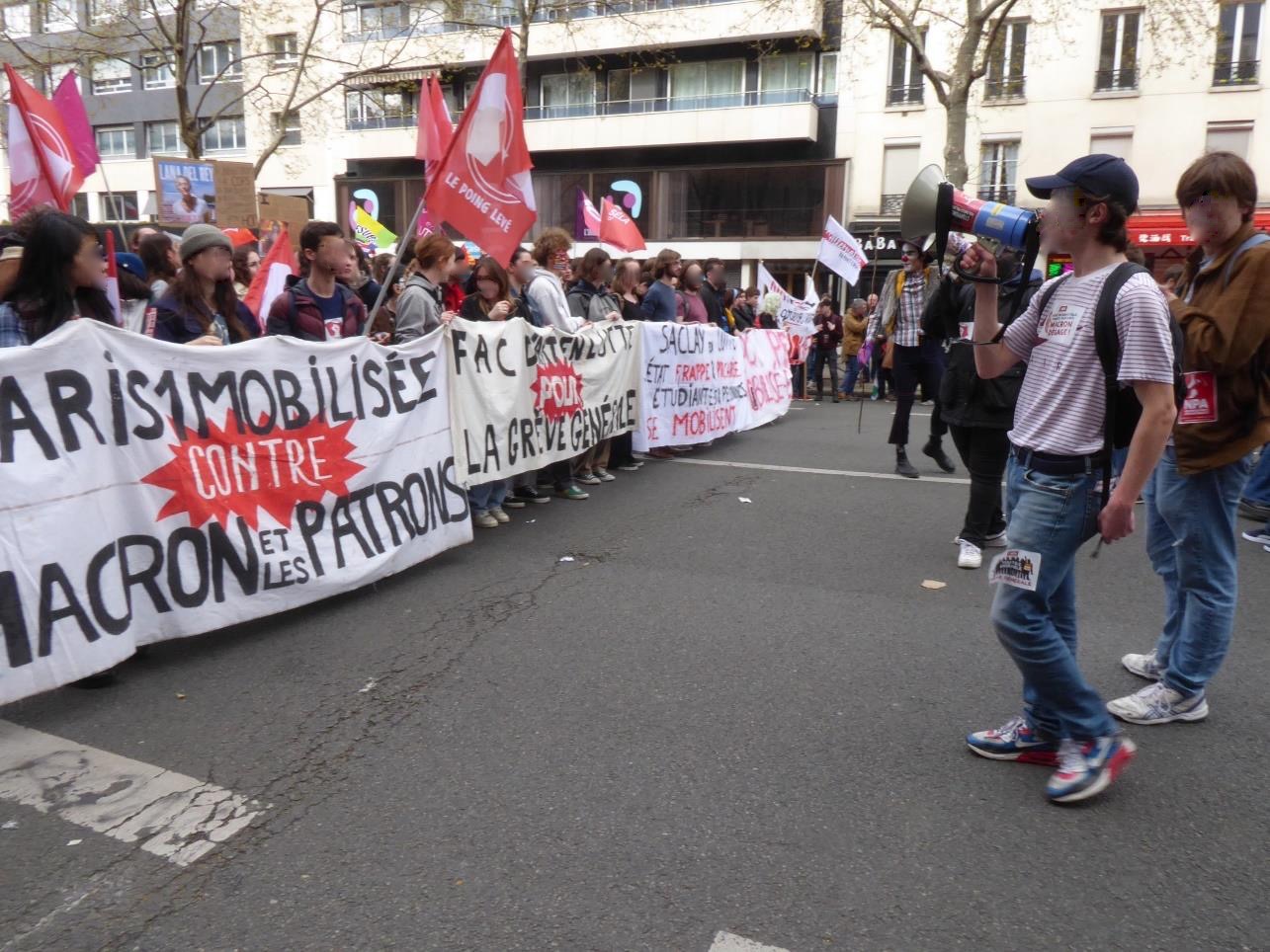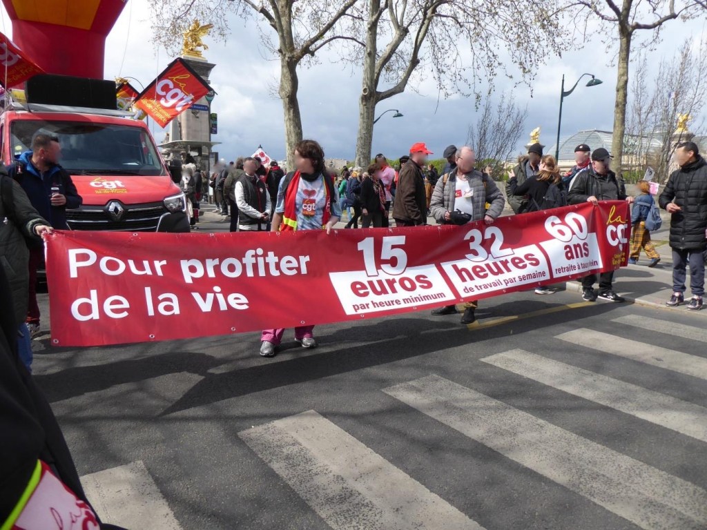 Viele Aufkleber von unterschiedlichsten Gruppen zieren die Demoroute und werden verteilt, z.B. von der kommunistischen Partei (PCF), der anarchosyndikalistischen CNT (Conféderation nationale du travail), dem globalisierungskritischen Bündnis Attac sowie trotzkistischen Gruppen verschiedener Couleur, z.B. LO (Lutte Ouvrière = Arbeiterkampf), der ISA (Internationalist Socialist Alternative) und ihrer Frauenorganisation ROSA (Internationalist Socialist Feminists). Die Gewerkschaft der Computerspielearbeiter*innen ist unterwegs – ebenso wie ganze Schulen. Die Studierendengewerkschaften sind laut und gut organisiert, mit eigenen cortèges und Lautsprechern; die verschiedenen Blöcke haben vorne ein Front-Transparent, davor ein bis zwei Menschen mit Lautsprechern, die vor den anderen rückwärts laufen und den cortège anfeuern. Viele laute Frauenstimmen.