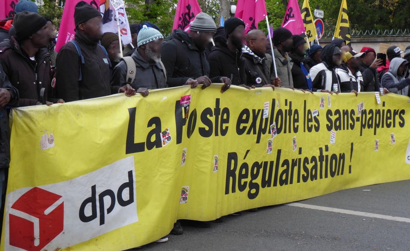 Etwas weiter vorne beeindruckt mich der cortège von SUD-Logistik. Er besteht ausschließlich aus afrikanischen Männern. Im Lautsprecherwagen wird getrommelt. Sie tragen ein großes Transparent, das die Ausbeutung in den Postzulieferdiensten anprangert. Die deutsche DPD (Dynamic Parcel Distribution, ein ausgegründetes Unternehmen der Deutschen Post) hat sogar die Ehre, explizit als Gegner auf dem Transparent genannt zu werden. Einer der Männer drückt mir ein Flugblatt in die Hand. Offenbar gibt es aktuell einen Streik in der Branche, der schon lange dauert und den mensch unterstützen soll. Er richtet sich gegen die gezielte rassistische Ausbeutung von Sans-Papiers (Menschen ohne legalen Aufenthaltsstatus) und generell gegen die Praxis des Subunternehmertums.