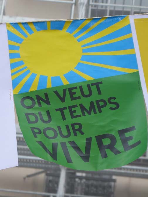Überall auf unserem Weg kleben bereits Aufkleber, wenn wir vorbeikommen: auf den Straßenlaternen, den Straßenschildern, den Bushaltestellen, den Ampeln, den Rollos der Läden (von denen viele vorsichtshalber geschlossen sind), an den Oberarmen, Jacken und Taschen der Demonstrant*innen, sogar im Gesicht. Da vorne ist ein Stand mit wirklich außergewöhnlich schönen Plakaten und Aufklebern. Das sind bestimmt die Studierenden der Université des Beaux Arts (Kunstuniversität). Oder ein Künstler*innenkollektiv. Mir gefällt besonders ein Bild mit großer Sonne und dem Slogan: „Wir wollen Zeit, um zu leben“.