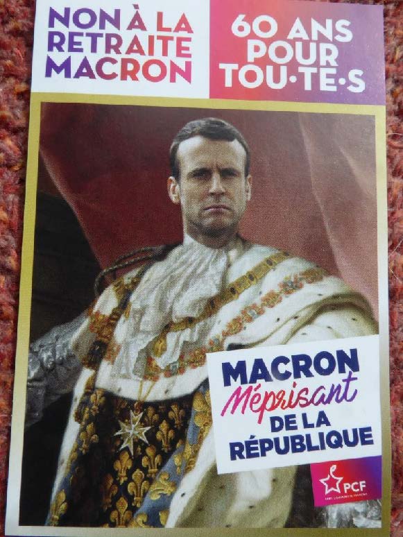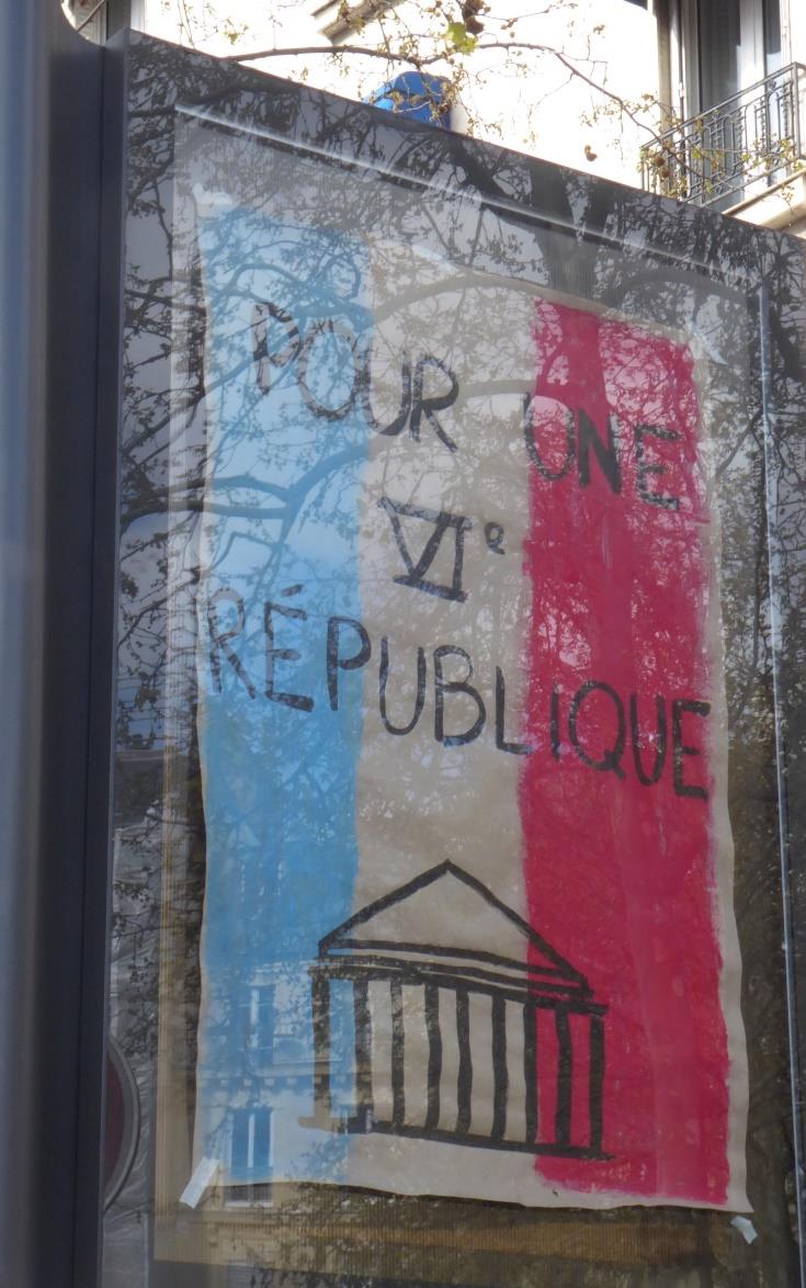 Auch die vielen Werbetafeln, die den Boulevard säumen, sind beklebt; manche sind auch ersetzt worden durch Plakate. Zwischen Bäumen hängen viele große Transparente. Inhaltlich drehen sich die Forderungen um dieselben Themen wie vor neun Tagen: Verteidigung der Rente – beziehungsweise Reduzierung des Rentenalters auf 60 Jahre oder früher; immer wieder geht es um das Thema Demokratie und dass diese aktuell mit Füßen getreten werde. Eine Frau hat ein Transparent dabei, auf dem ausführlich steht, was sie unter Demokratie versteht (angeblich „nach dem Schweizer Modell“. Ob da die Schweizer*innen wohl gleicher Meinung sind?). Gefordert wird jedenfalls 1. ein imperatives Mandat für die Abgeordneten; diese sollen ihren Wähler*innen permanent direkt verantwortlich bleiben, 2. Gesetzeserlasse durch Volksabstimmungen und 3. die gesetzlich vorgesehene Möglichkeit, einmal erlassene Gesetze auf Forderung der Bevölkerung hin, wieder zurückzuziehen. Auf einem anderen Plakat wird eine „VI. Republik“ gefordert – also eine neue Verfassung.