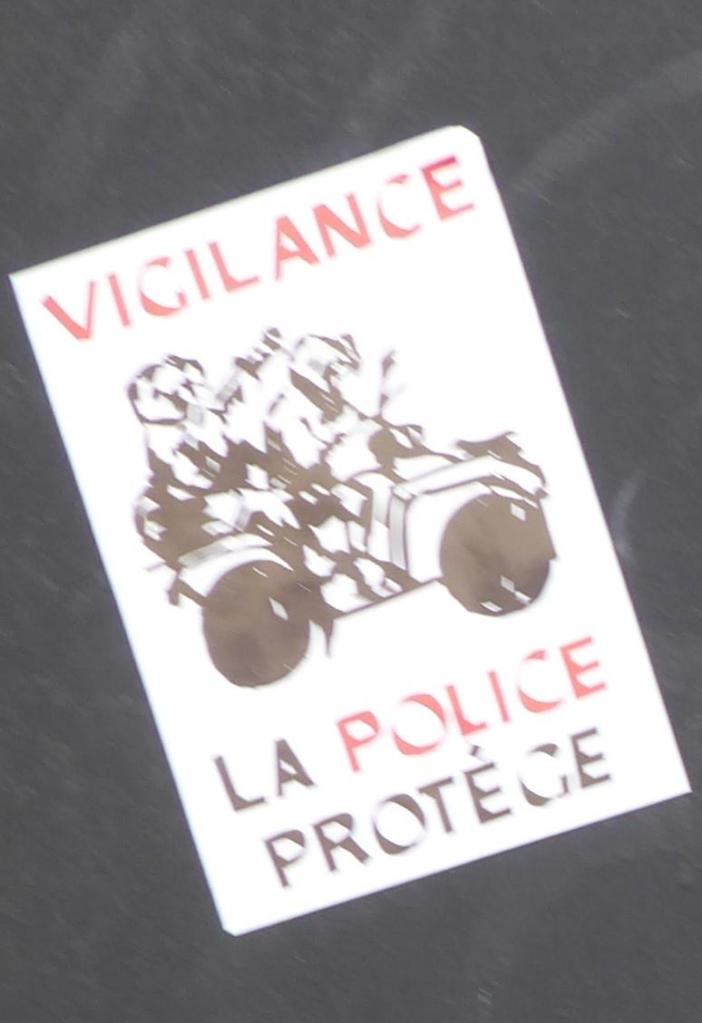 Im Vergleich zur letzten Demonstration vor neun Tagen scheinen mir auch mehr „allgemeine“ Slogans präsent zu sein: gegen Sexismus, für Queer-Rechte, gegen Faschismus („je suis faché, pas facho“ = ich bin wütend, aber kein Faschist; „pas de facho dans le quartier – pas de quartier pour les fachos“ = Kein Faschist im Stadtviertel – kein Stadtviertel für die Faschisten), für die Anerkennung der Sans-Papiers, gegen Abschiebung, für soziale Gerechtigkeit, Klassenkampf, eine bessere Welt. Auch hübsch: „Patrons, patrie, patriarchat – meme racine – meme combat“ (Arbeitgeber, Vaterland, Patriarchat – gleiche Wurzel, gleicher Kampf). Prominent sind viele Parolen und Aufkleber gegen Polizeigewalt, z. B. „Vorsicht, hier schützt die Polizei“.