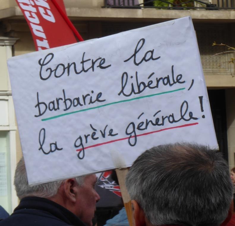 Immer wieder hört man das Lied: „On est là, on est là, même si Macron ne veut pas, nous, on est là, à l’honneur des travailleur et pour un monde meilleur, on est là“. (Wir sind da. Wir sind da. Auch wenn Macron das nicht will, wir sind da. Zu Ehren der Arbeiter und für eine bessere Welt, sind wir da). Margot tauscht beim Singen „travailleur“ gegen „chomeur“ (zu Ehren der Arbeitslosen). Aber mensch hört auch andere Lieder: Bella Ciao, Manu Chao mit „il faut se motiver“ (man muss sich motivieren) und „Le chant des partisans“ (das „Lied der Partisanen“ war das populärste Lied der französischen Résistance im Zweiten Weltkrieg), die Partisanen von Amur. Zwischendurch sehen wir einen Wagen mit einer Gruppe Frauen, „les Rosis“, sagt Margot, die eine Art Rave-Party veranstalten. Die Leute tanzen und recken im Rhythmus die Fäuste hoch. Die Themen der Mobilisierung: Die Rentenreform selbstverständlich, Rente ab 60 Jahren ist die offensive Forderung; manchmal wird aber auch schon die Rente ab dreißig Jahren oder ab sechs Jahren gefordert – oder wahlweise ein gesichertes Einkommen.