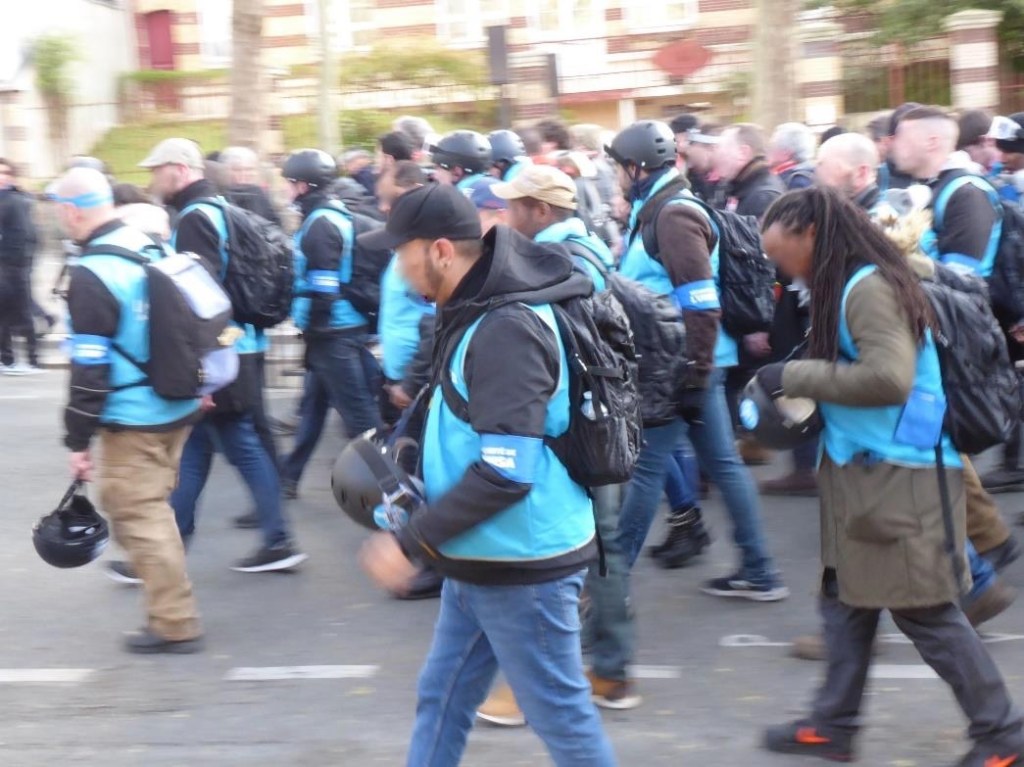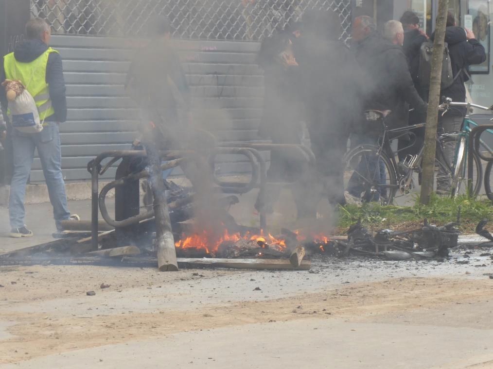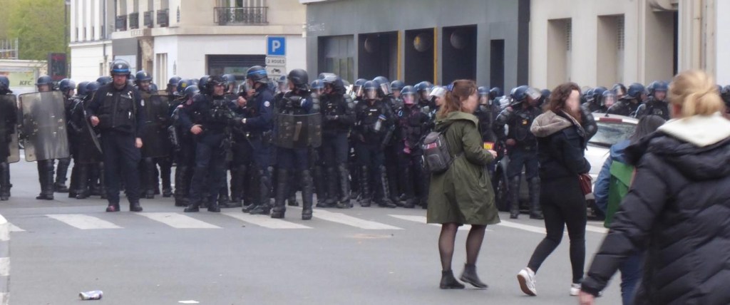 Ich komme mir ganz ungeschützt und etwas naiv vor, hoffe, dass wir diese Ausrüstung nicht brauchen. Inzwischen liegen Steine herum. Holzplanken sind von Baumeinfriedungen abgerissen. Sogar ein Eisenpfeiler, der im Pflaster versenkt war, liegt lose herum. Wieder mal bleiben wir stehen. Wieder mal geht es weiter. Ariana meint: „Ils font leur boulot“ (= sie machen ihre Arbeit). „Wen meinst Du?“, frage ich. Die Polizei? Die Feuerwehr? „Les casseurs“ (= wörtlich die „Zerschlager“). Sie meint die (zumeist) Jugendlichen, die die Demo umringen, ihr vorangehen und für Militanz sorgen.