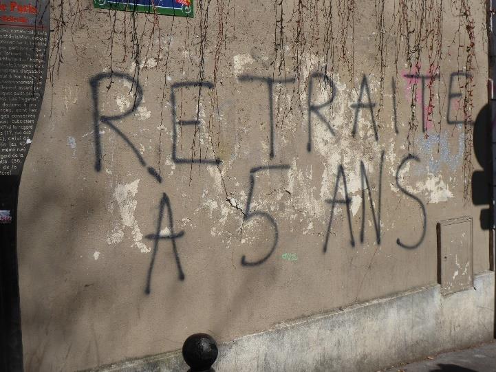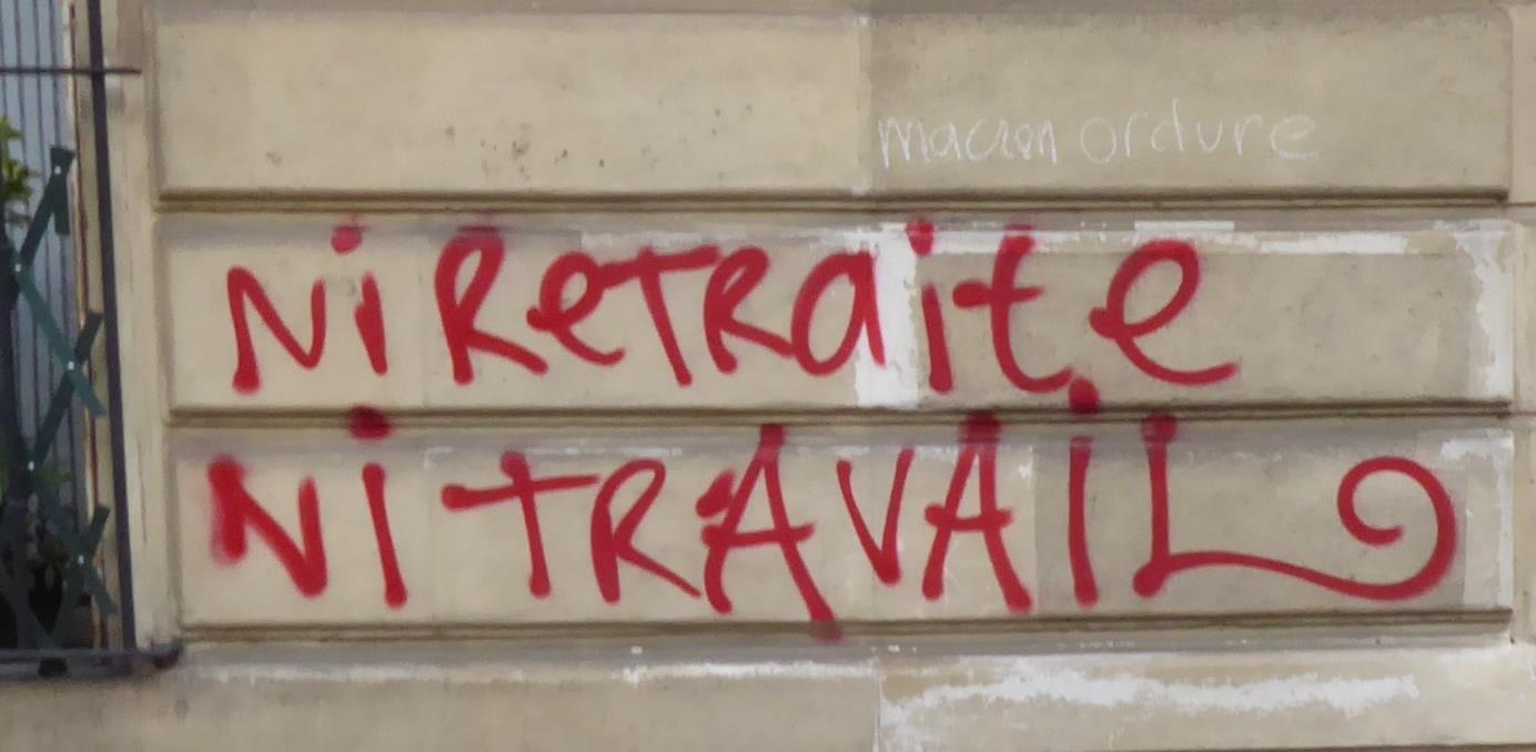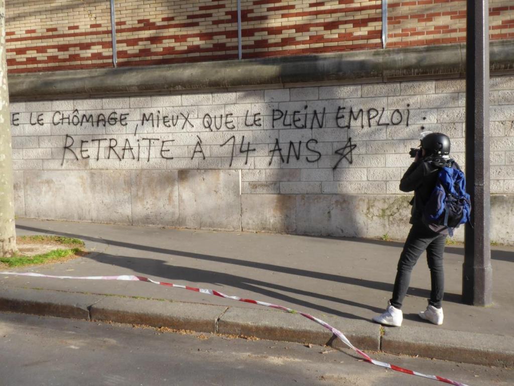 Am Boden bunte Farbspritzer, wohl von Farbeiern. Die typische Dramaturgie der Anti-Rentenreform-Demos wird mir nun zunehmend klar. Ab etwa der Hälfte beginnt der militante Widerstand. Nun sind die Wände an beiden Seiten der Demonstration zunehmend – und fast ausnahmslos – besprüht. Im Laufe der Demo sind es Hunderte. Die Parolen sind inhaltlich deutlich radikaler als die Schilder der meisten Demonstrant*innen. Es geht oft um Revolution – sei sie kommunistisch oder anarchistisch. Besonders in Erinnerung bleibt mir „ni travail; ni retraite“ (weder Arbeit noch Rente).