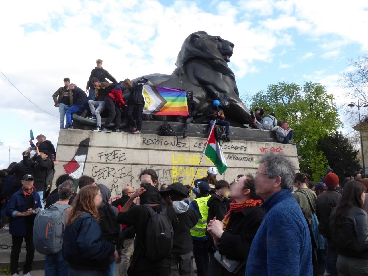 Dann stehen wir an einer Kreuzung und kommen nicht weiter. Vorne geht die Polizei zum ersten Mal in die Menge. Wir wissen nicht, was los ist. Es brennt wieder. Es knallt. Das sind die Kartuschen mit Tränengas. Wir riechen es auch ein bisschen. Dann geht es doch wieder weiter. Auf dem Place Denfert-Rochereau sind die Youngsters auf die Löwen des Denkmals geklettert. Dieses ist freilich auch umfassend besprüht worden. Fahnen und Transparente werden geschwenkt.
