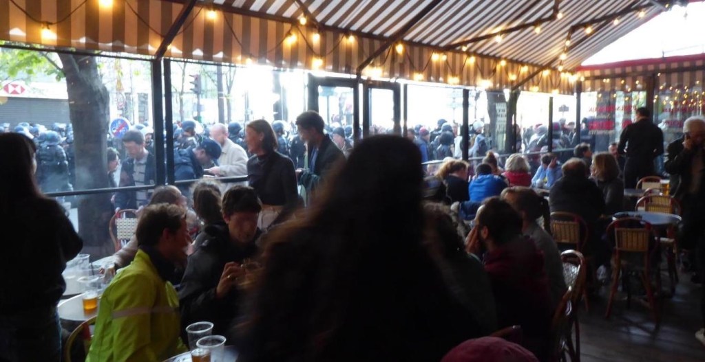 Wir beschließen, nicht auf dem Platz zu bleiben. Die Lage ist zu unübersichtlich und man riecht das Tränengas und den Rauch. Ich kenne da drüben ein Café. Um es zu erreichen, müssen wir einzeln durch die Polizeisperre hindurchgehen. Sie lassen uns passieren. Im Café ist tatsächlich noch ein Platz in der Ecke frei, obwohl die Party in vollem Gange ist. Die Gäste sind alle (Ex-)Demonstrierende. Sie singen, skandieren lauthals Parolen und sind offensichtlich nicht mehr ganz nüchtern. Wir haben von der überdachten Terrasse aus einen hervorragenden Blick auf die ca. 50 Polizist*innen (es sind tatsächlich einige wenige Frauen dabei), die an dieser Seite den Place d’Italie absperren.