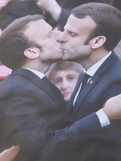 Da vorne ist wieder das „Demotelephon“, das wir neulich auch schon gesehen haben. Es handelt sich um eine Art Performance. Man kann im Élysée-Palast (Sitz des Präsidenten) anrufen und seine Meinung sagen – aber Macron hört leider chronisch nicht zu. So wie auf den Plakaten, die ihn zeigen, wie er sich selbst küsst.