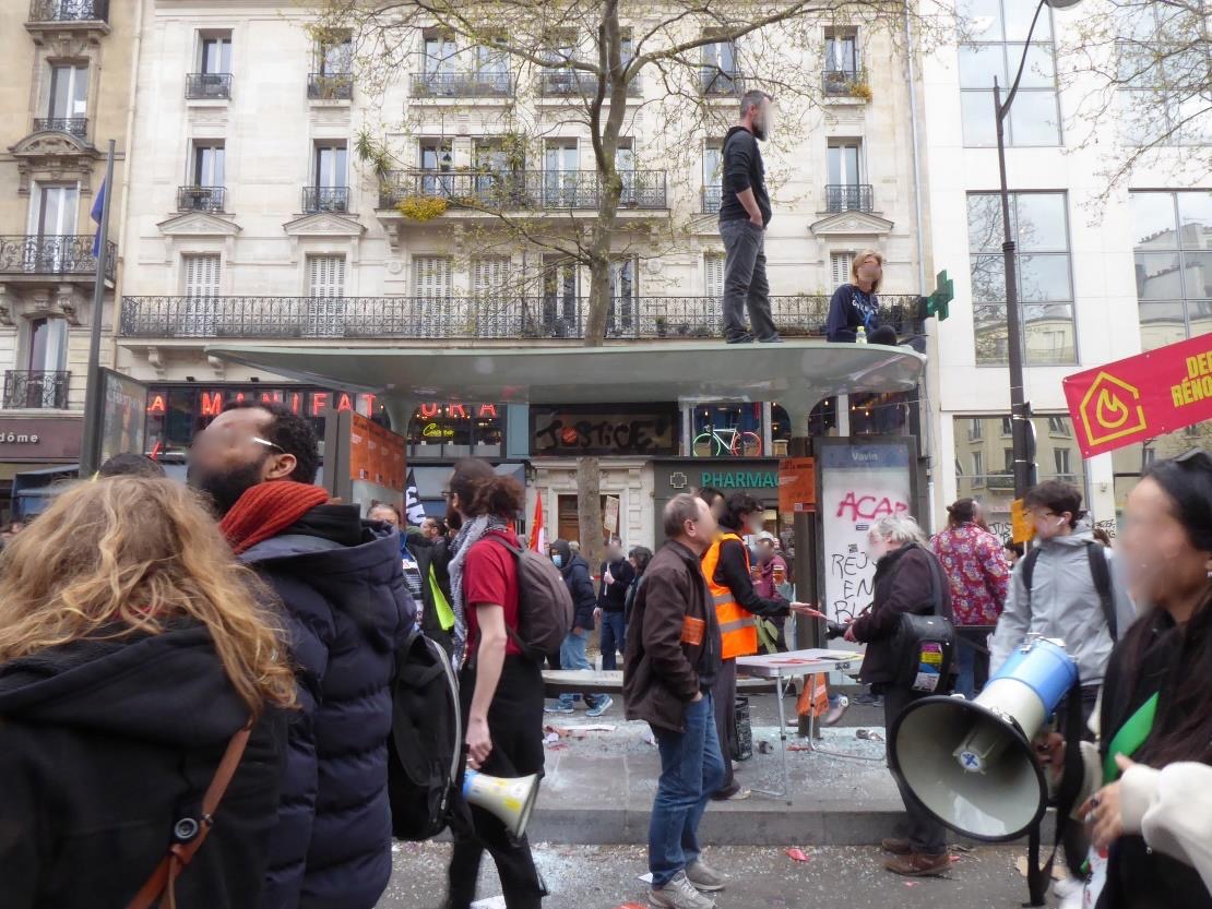 Noch vor der Place de la République schlägt Margot vor, ein Bierchen zu trinken. Sowas tue ich in Deutschland auf Demos nie. Und tagsüber eigentlich auch nicht. Aber wir finden keinen Patron (Chef eines Cafés), der uns ein Bier serviert. Überall ist es zu voll. Daher gehen wir in den nächsten Supermarkt, kaufen zwei canettes (Bierdosen) und setzen uns einen Moment auf den Place de la République. Auf dem Denkmal klettern Menschen herum. Es ist besprüht, beklebt, Transparente hängen daran. Wir gehen weiter. Erneut ist der Demozug sehr langsam, wenn er sich vom Place de la République in den – eigentlich wahnsinnig breiten – Boulevard hineinquetscht. Weiter vorne auf einem Baugerüst tummeln sich Menschen, um den Riesendemozug von oben zu betrachten. Jemand hat die Tür zum Baustellengerüst aufgestemmt, so dass alle das Gerüst betreten können. Auch auf anderen Gerüsten wird geklettert. Eine Frau sitzt oben auf einem Bushaltestellenhäuschen. Nun fängt es an, dass Reklamewände und Bushaltestellenhäuschen zersplittert sind.
